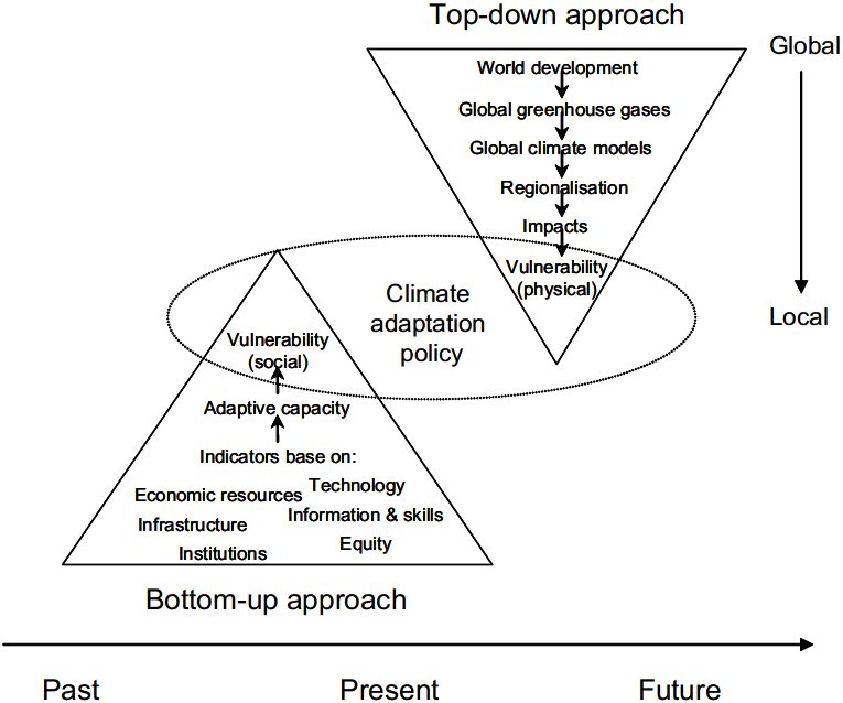 Heltberg et al. (2008) define adaptation as: “adjusting to address ongoing and future climate changes” (pg. 89). Smit and Pilisova (2001) expand on this by focusing adjustments on “Ecological, social and economic systems” (pg. 881). Furthermore they state that adaptation can be a response to “actual or expected” stimuli (pg. 881). There is a substantial difference in adaptation approaches, depending on whether adjustments are made to actual, or expected, stimuli. This essay will analyze this difference in approach, by reviewing the effectiveness of ‘Top-Down’ and ‘Bottom-Up’ approaches to adaptation, and the divide in the definition of the ‘vulnerability’ they address.