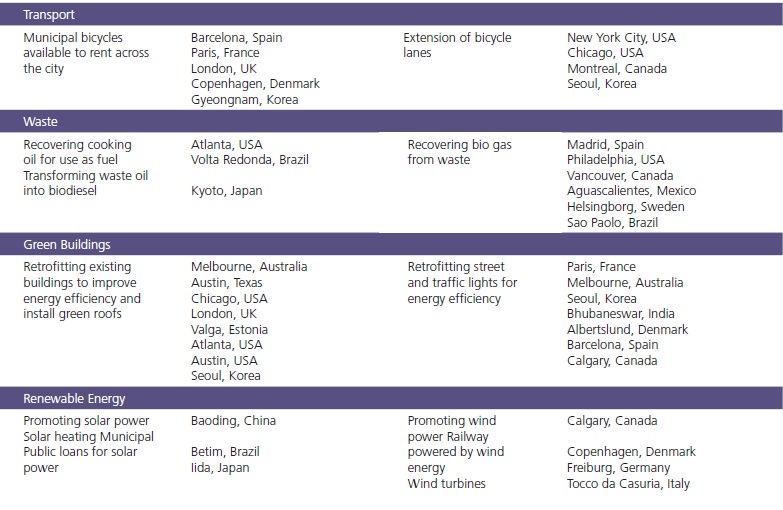 Other efforts by cities which are worth mentioning are South Korea’s Seoul’s encouragement of the construction of buildings through the provision of tax incentives for those built as eco-friendly (UN-HABITAT). Similarly in Stockholm, Sweden it has been noted that the congestion tax has increased public transit and decreased traffic volume (ICLEI 2011). In 2006 Cape Town, South Africa was the first African city to adopt an energy and climate strategy and in its action plan of 2009 looked to work towards the goal of a 10% reduction of CO2 emissions by 2014 from a 2009 level (WWF).