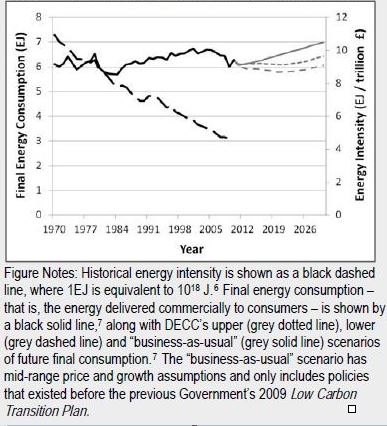 Decreased energy intensity does not always correlate positively with total energy consumption reduction. Since the 1970s, the UK’s overall energy intensity has decreased because GDP has increased while energy used has remained steady (Allen, 2012). Its total energy use, however, has not declined and its business-as-usual scenario shows that the total consumption will continue to rise (figure 5).