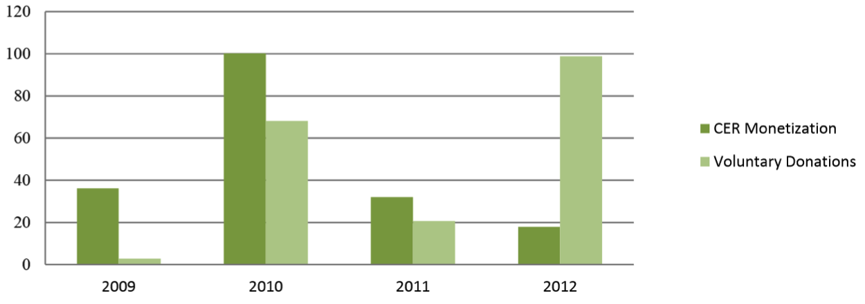 Figure 2: Certified Emission Reductions monetisation (CER) and voluntary donations to the AF (figures in USD million) (sources: Climate Funds Update 2013c, Adaptation Fund Board 2012)