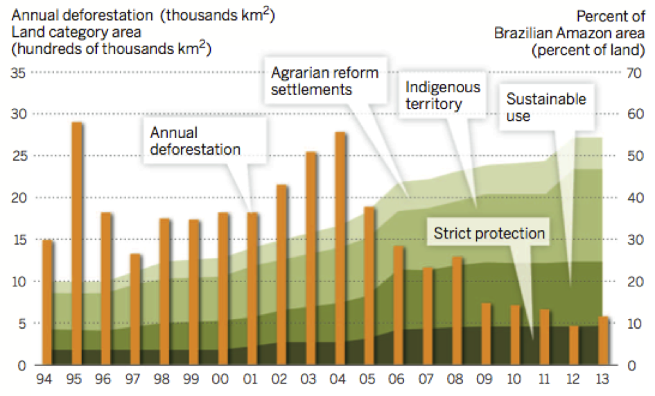 Figure 2: Annual deforestation and the area of indigenous territories, sustainable development reserves (e.g., extractive reserves), strict protection reserves, and agrarian reform settlements.