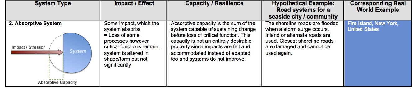 The original post defined 6 types of systems: Resilient, Absorptive, Adaptive, Failed, Transformative, and Maladaptive. The table below presents a visualization of this systems approach to adaptation, which illustrates properties of resilience when responding to climatic stressors. The red impact/stressor arrow represents environmental stressors. A fourth column has been added to the original conceptualization. In this column a hypothetic example that resides within our selected system is given. The newly added column demonstrates how the new visualization can be applied to real world scenarios.